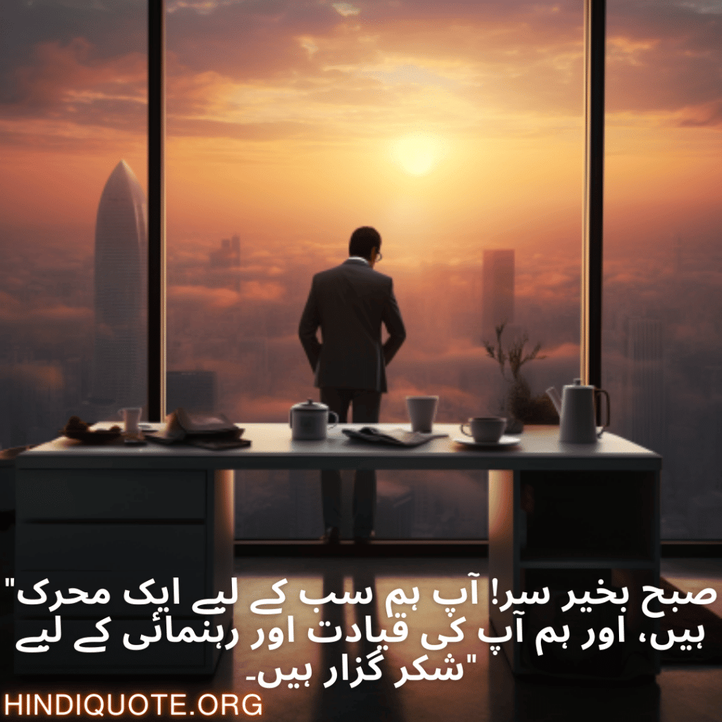 Good morning Quotes In Urdu For Your Boss "صبح بخیر سر! آپ ہم سب کے لیے ایک محرک ہیں، اور ہم آپ کی قیادت اور رہنمائی کے لیے شکر گزار ہیں۔"